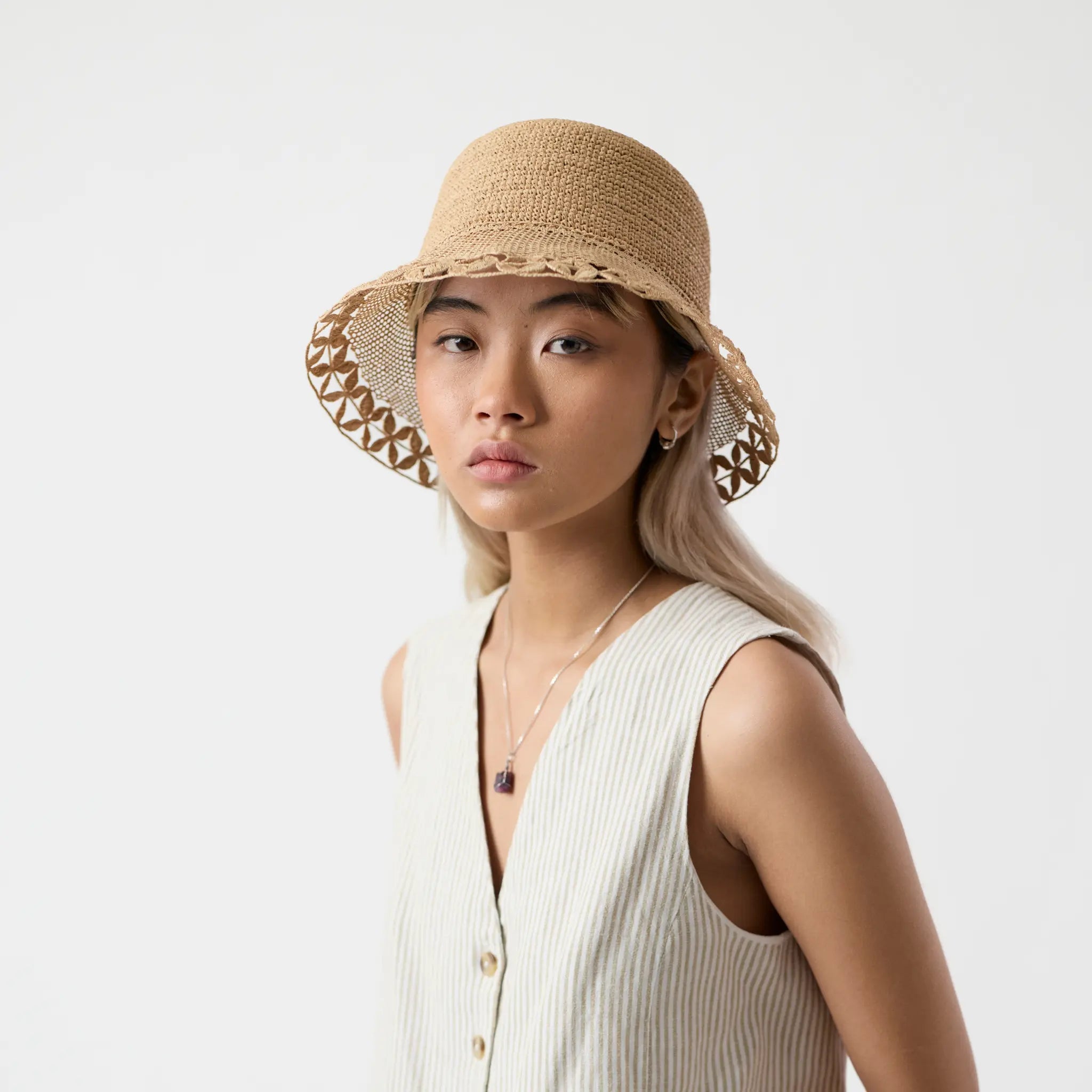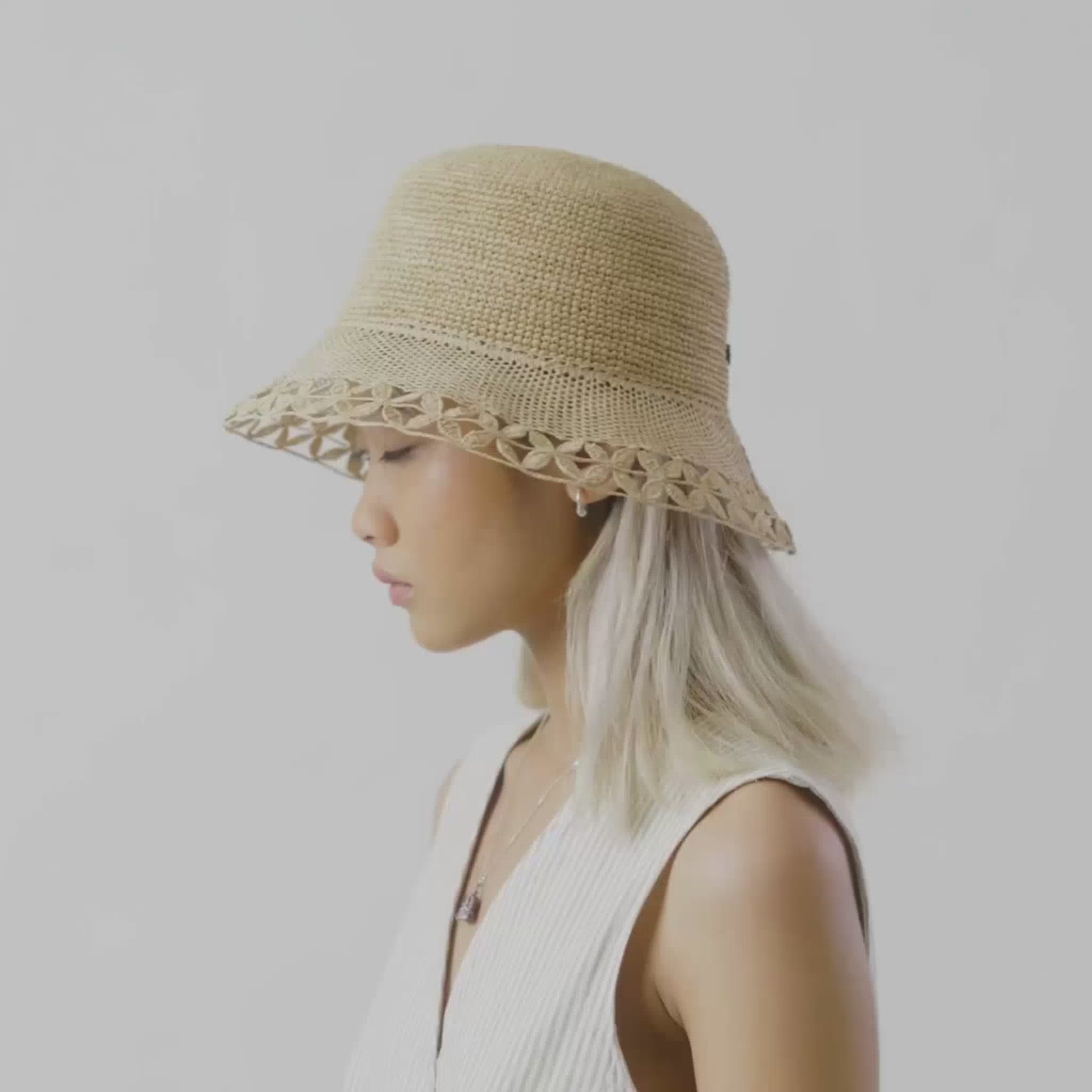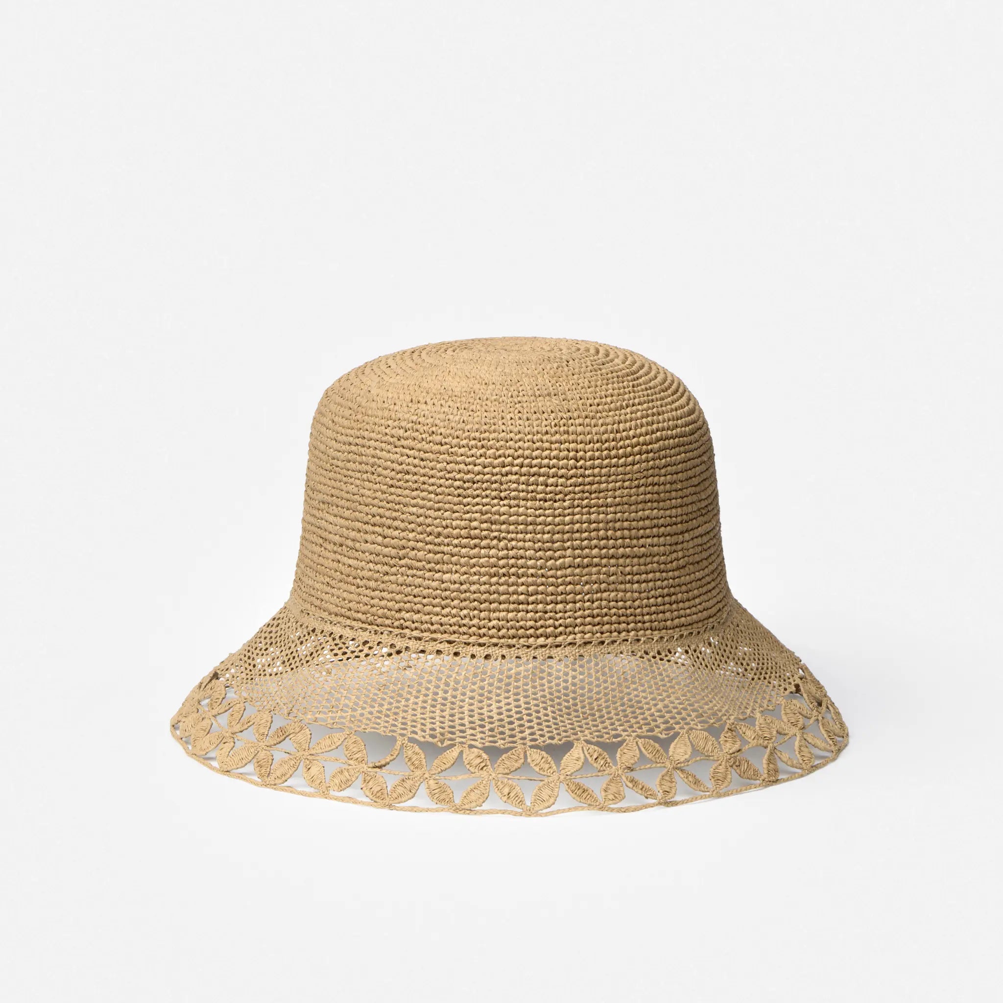 A one-of-a-kind bucket hat with its laced-edged brim, BOKETY will match the Boka clutch for an elegant combination. Joined to the crochet crown with no visible seam, BOKETY's brim displays raffia bobbin lace, a technique that is becoming rarer in the face of globalisation.