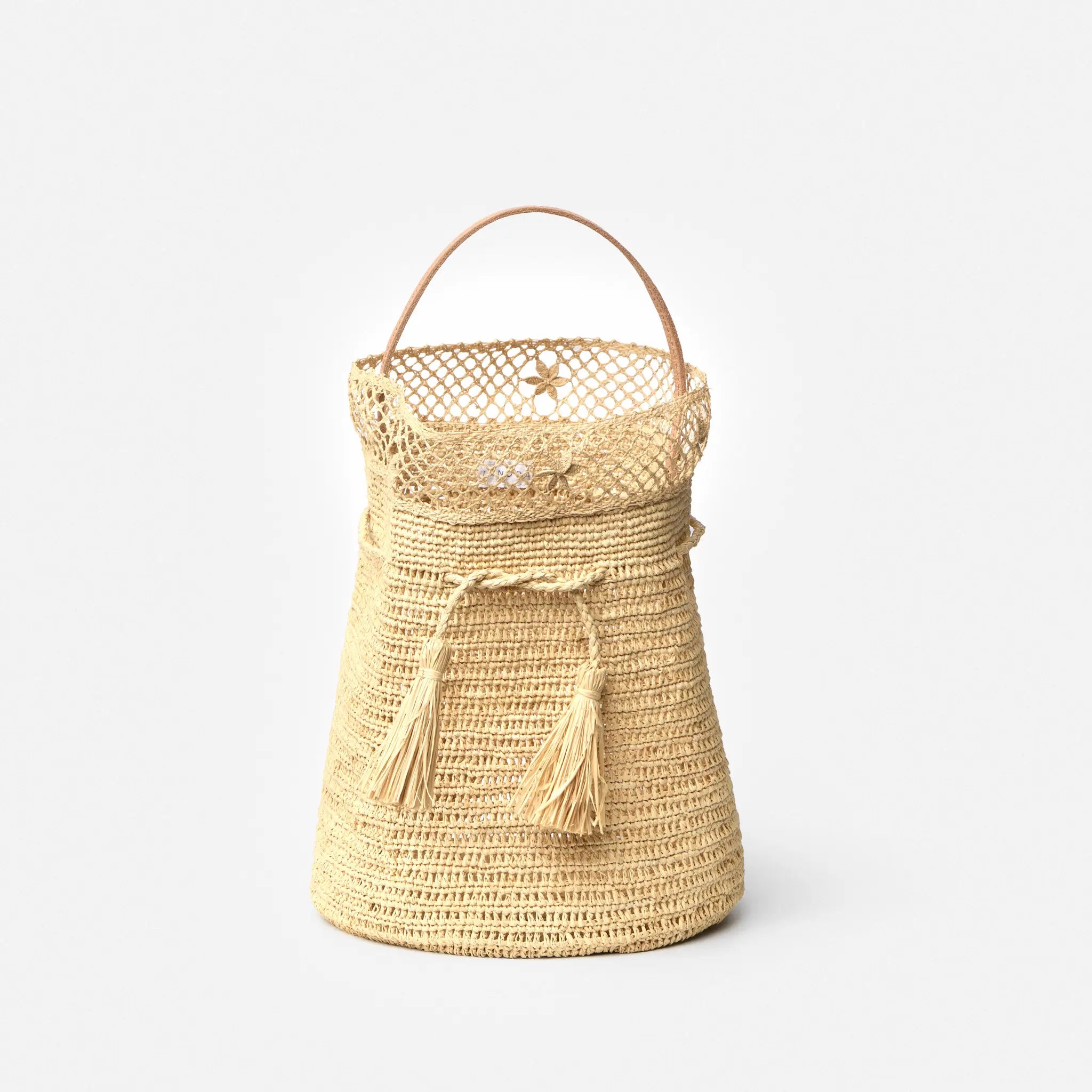 BOMBO is a modern adaptation of the traditional bonbonnière. This crochet and lace wrist-bag is a romantic journey. Seamlessly joined to the crochet body with no visible ties, BOMBO displays the true art form of raffia bobbin lace, a technique that is becoming more rare in the face of globalisation.