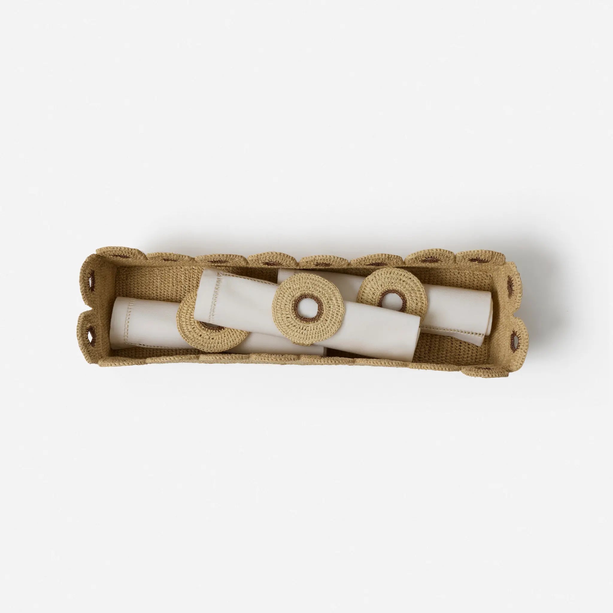 Rectangular and raffia crochet-crafted, the Lavaka Bread Basket features a scalloped edge with delicate eyelet detailing. Its refined shape and subtle texture make it a striking centrepiece for the table, whether for serving or styling.