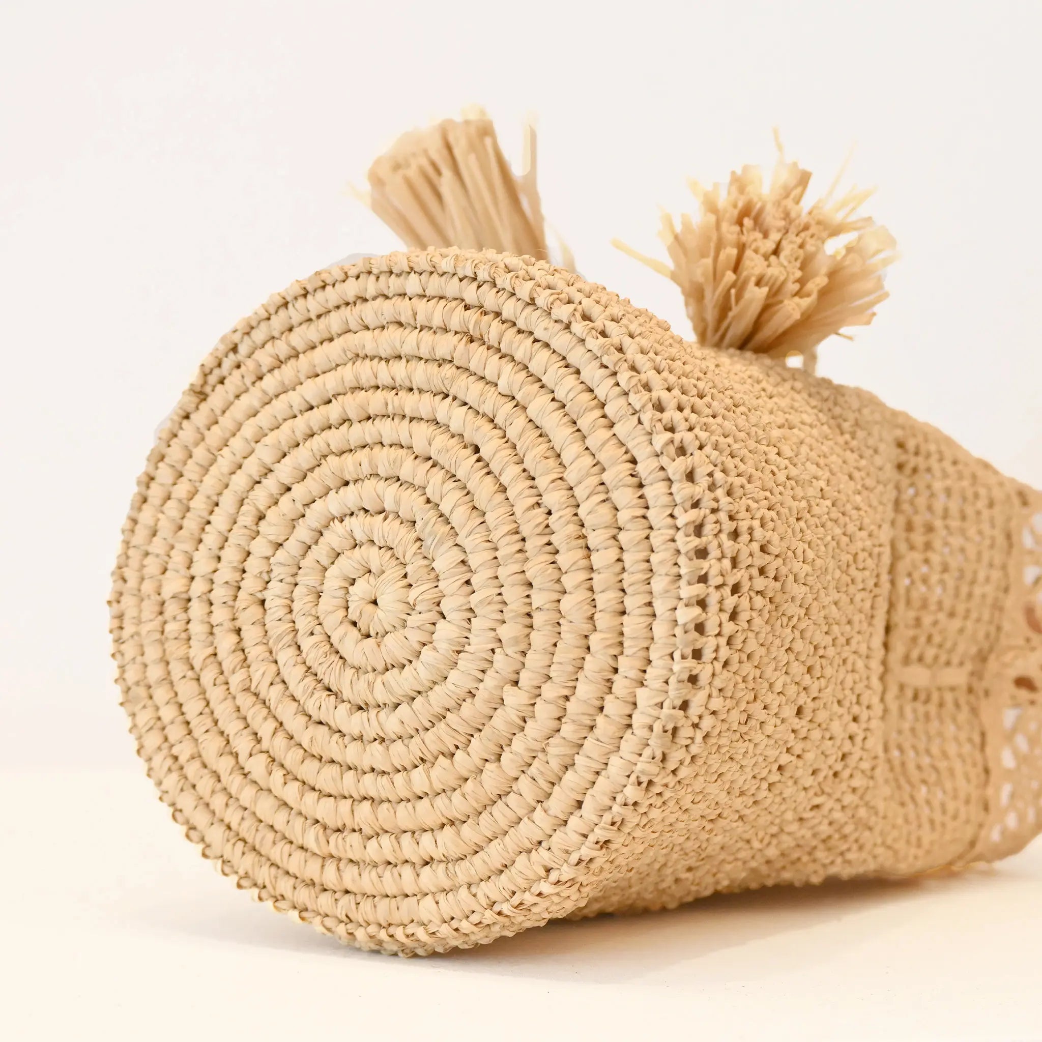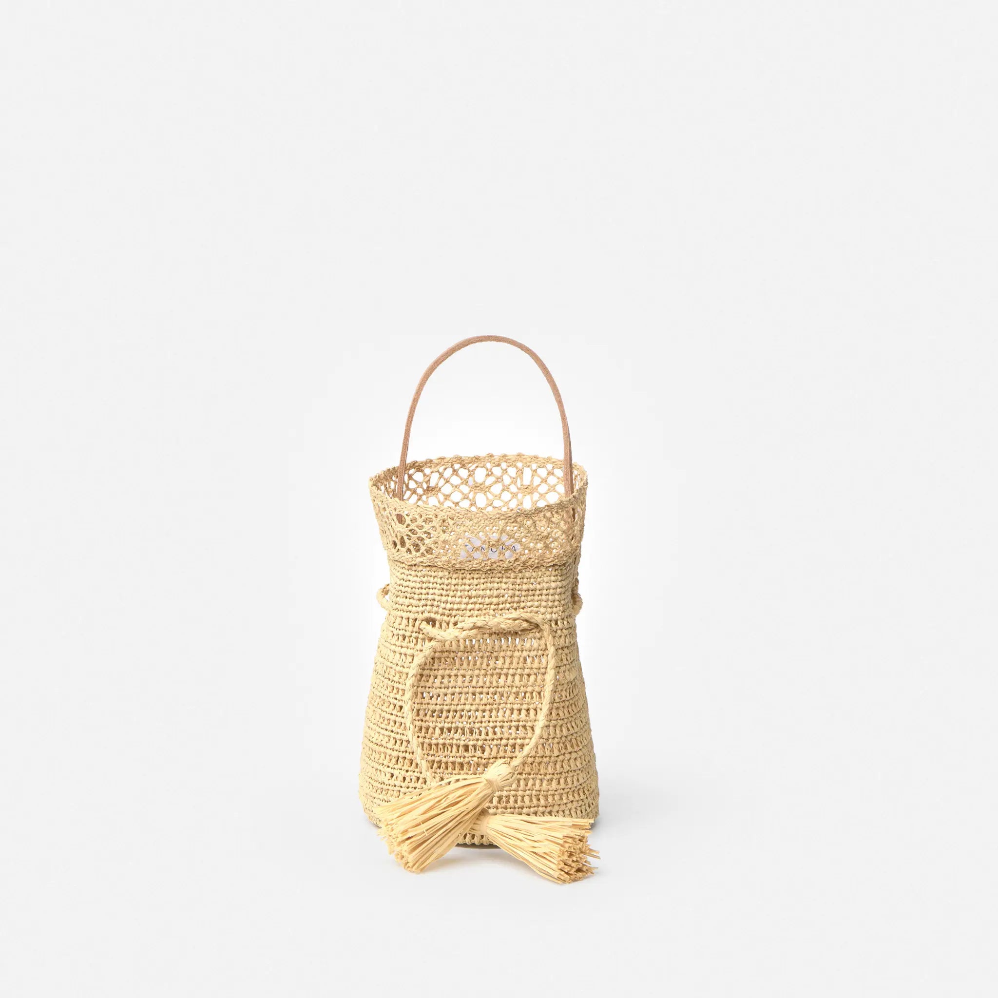 The mini version of our signature wrist bag Bombo, MINI BOMBO is an adaptation of the traditional bonbonnière, or the small drawstring bag distributed at traditional European weddings with sweet party favours. This little crochet and lace wrist handbag is a petite delight.