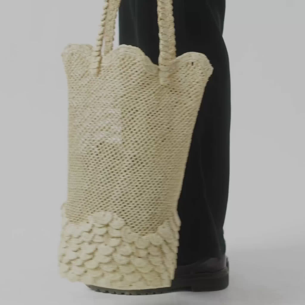 TSARA Tote bag features intricate textural stitches that recreate nature's tree bark and leaves. This lightweight woven tote showcases an open weave design with an elegant scalloped base, combining artisanal craftsmanship with everyday functionality. Spacious enough for daily essentials yet refined for coastal getaways, this natural straw bag brings organic beauty to every outing. Style it with the RAVIN Bucket Hat for a naturally refined pairing.